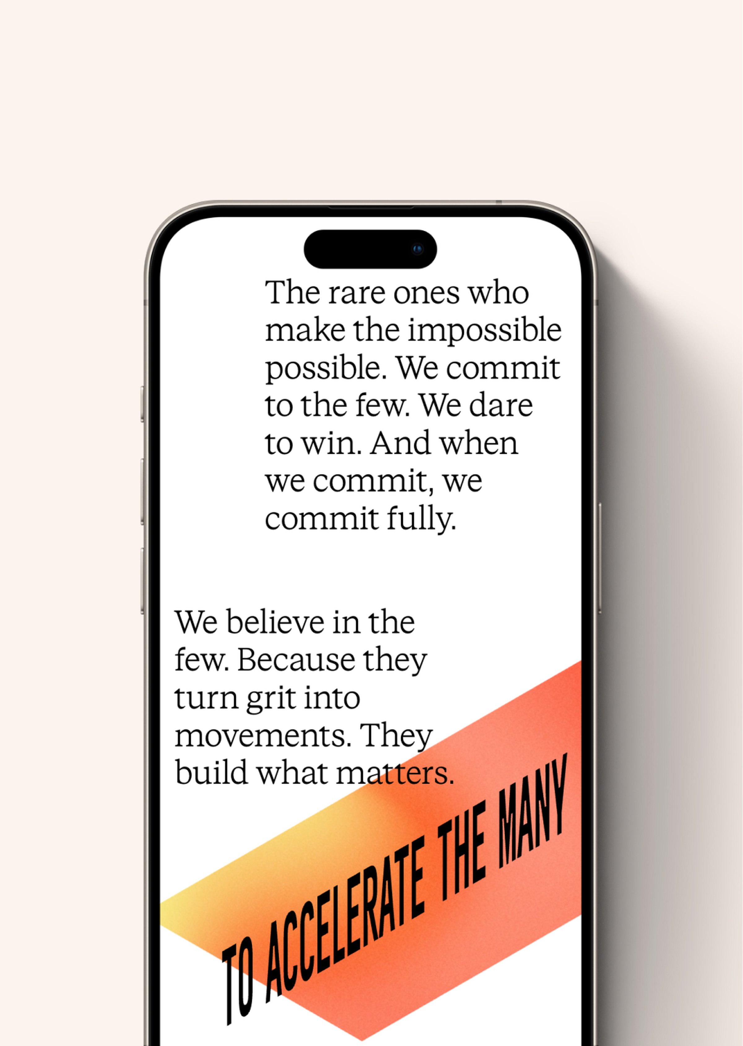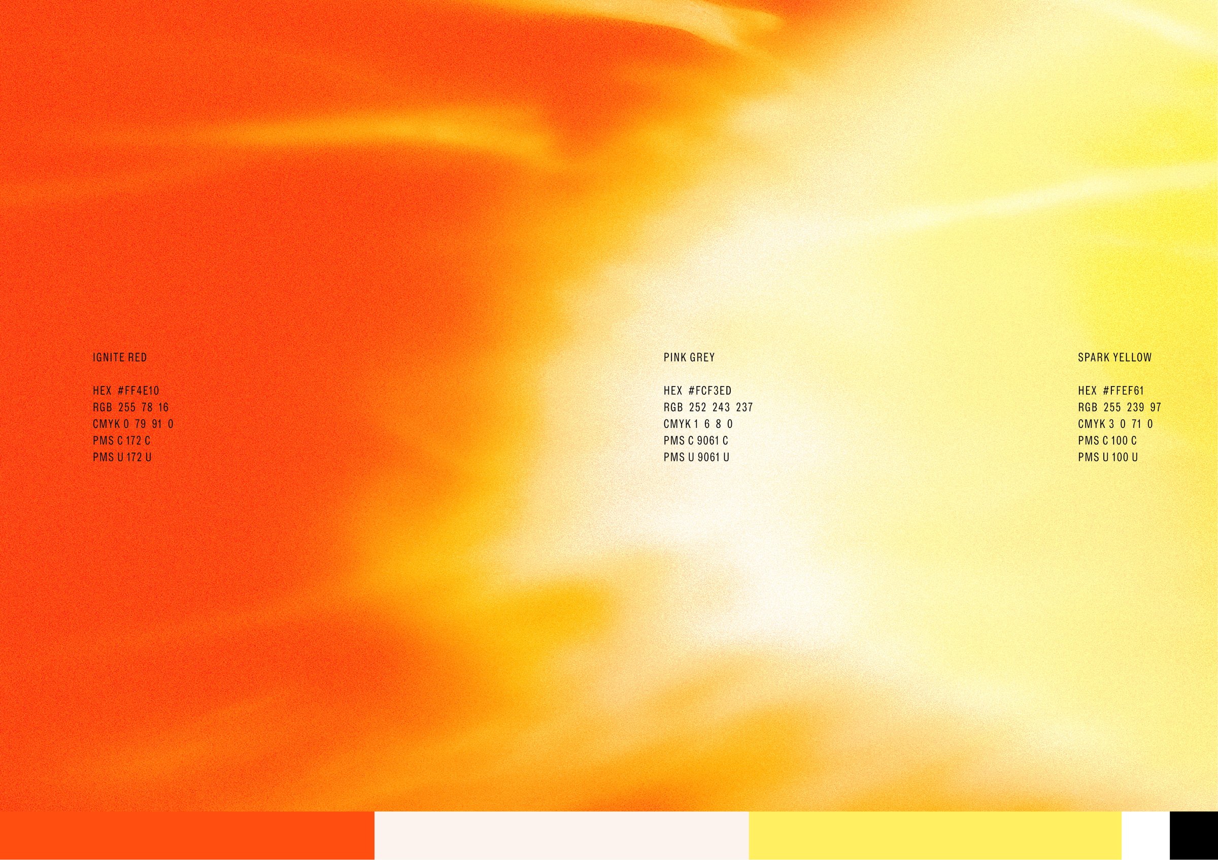 Ignition and acceleration became the cornerstones of the logotype. The first part sparks. The second races forward, tilting upward with momentum. Simple. Distinctive. But an identity is more than a logo. Headlines were designed as vessels of acceleration, pushing into a brighter future. Colours and gradients nod to the flame — the spark that sets everything in motion. The result: an identity that dares to win.