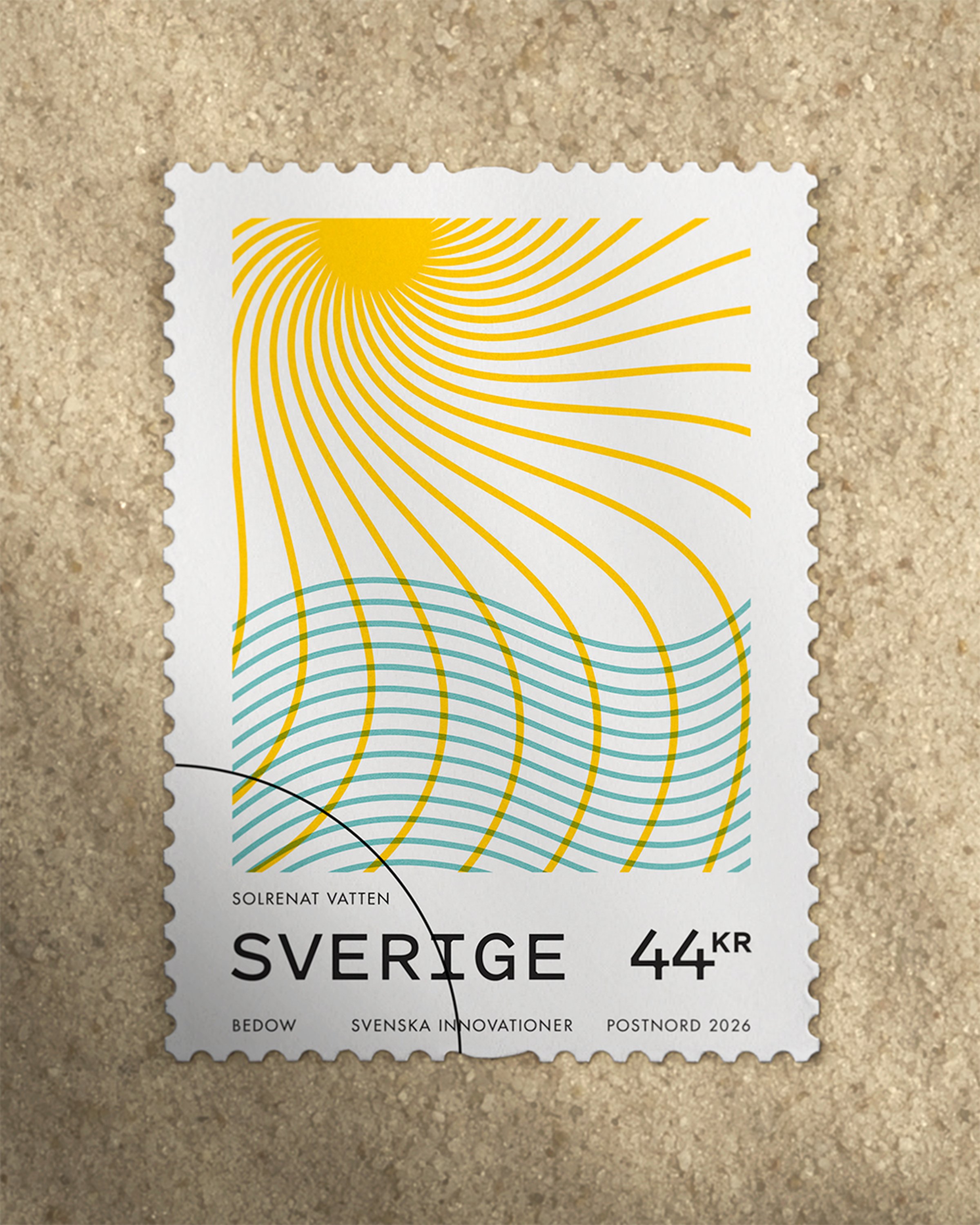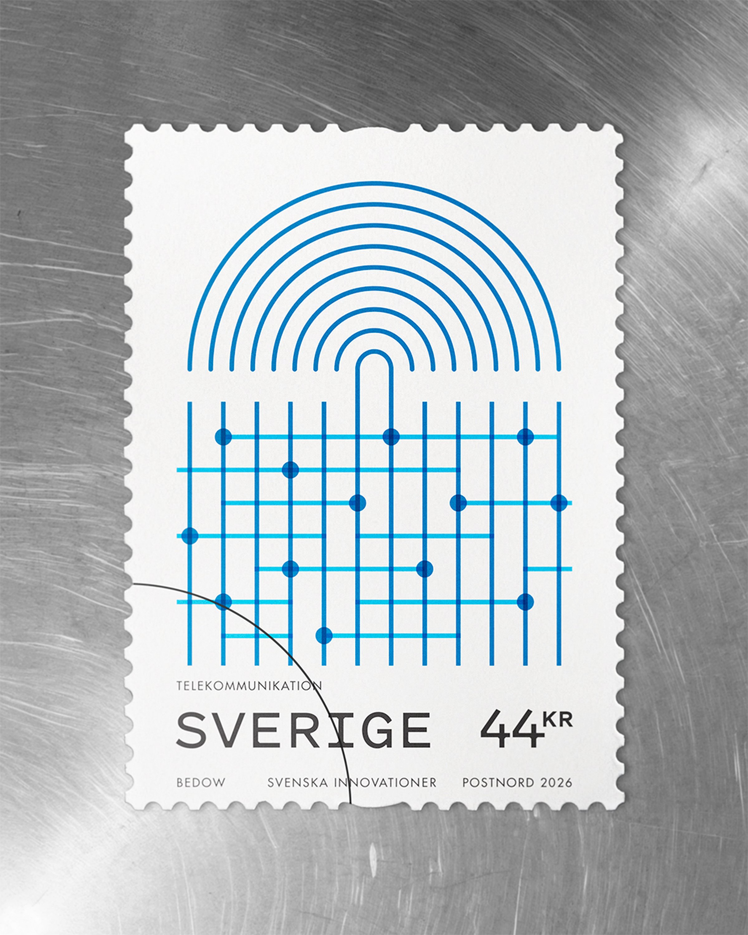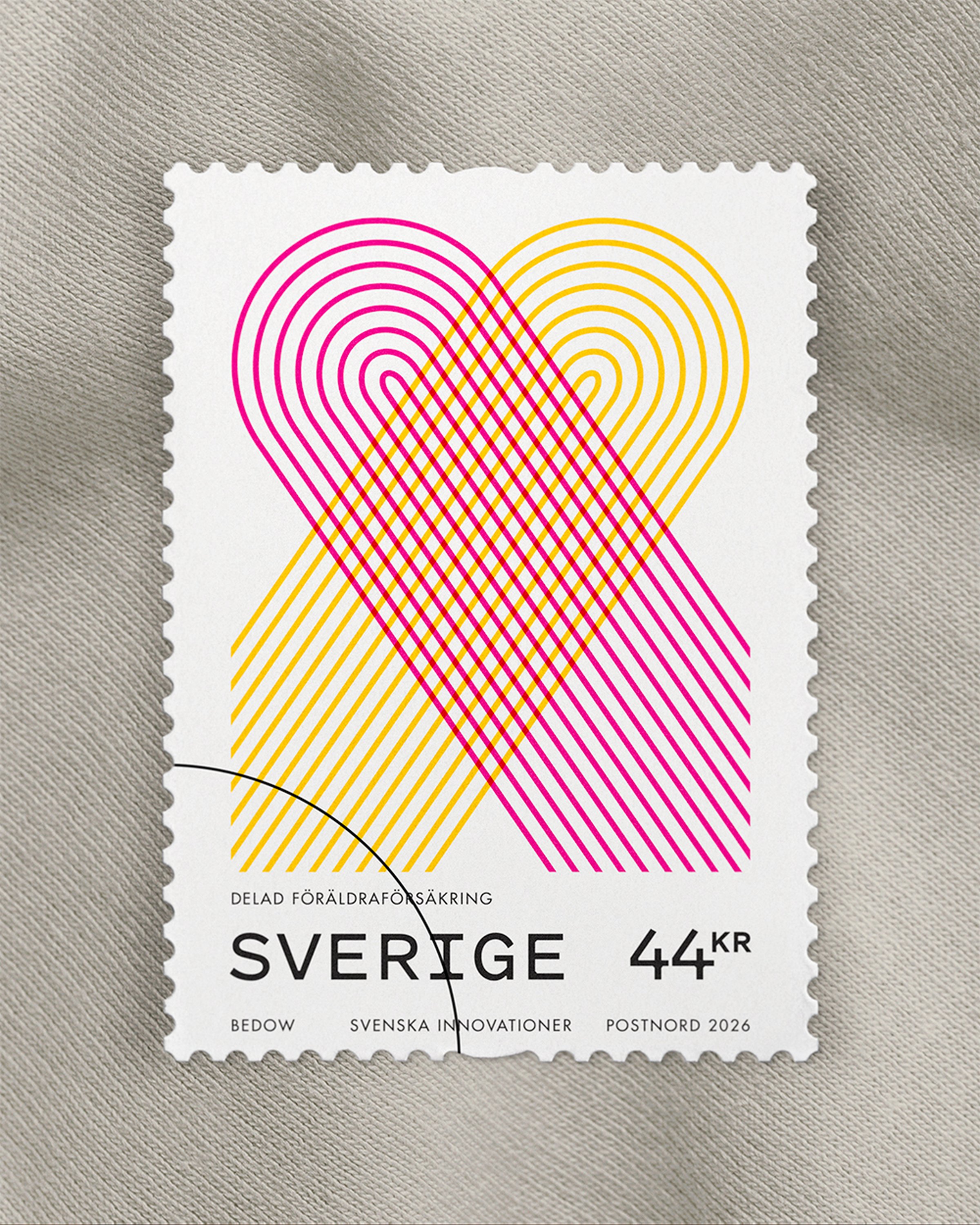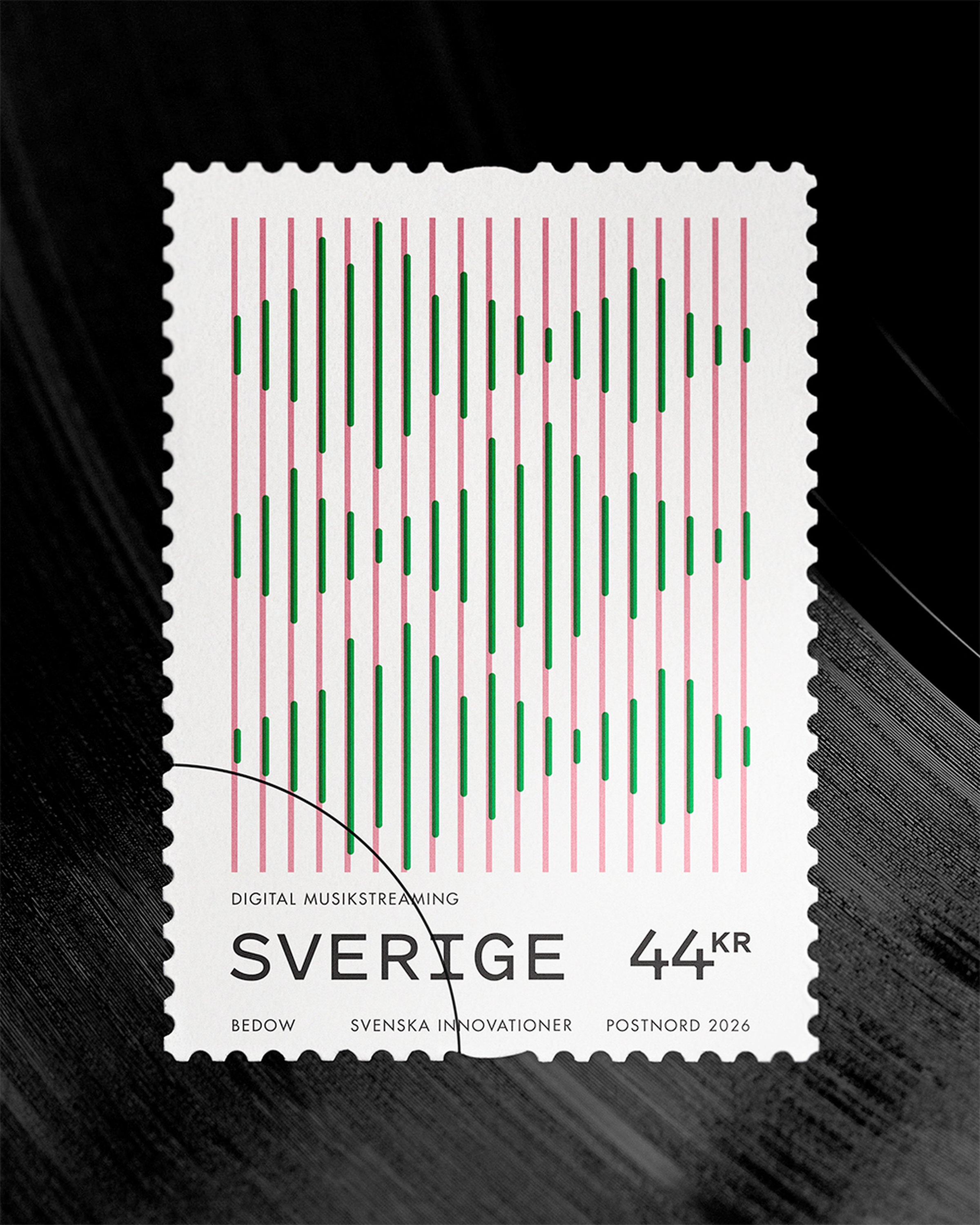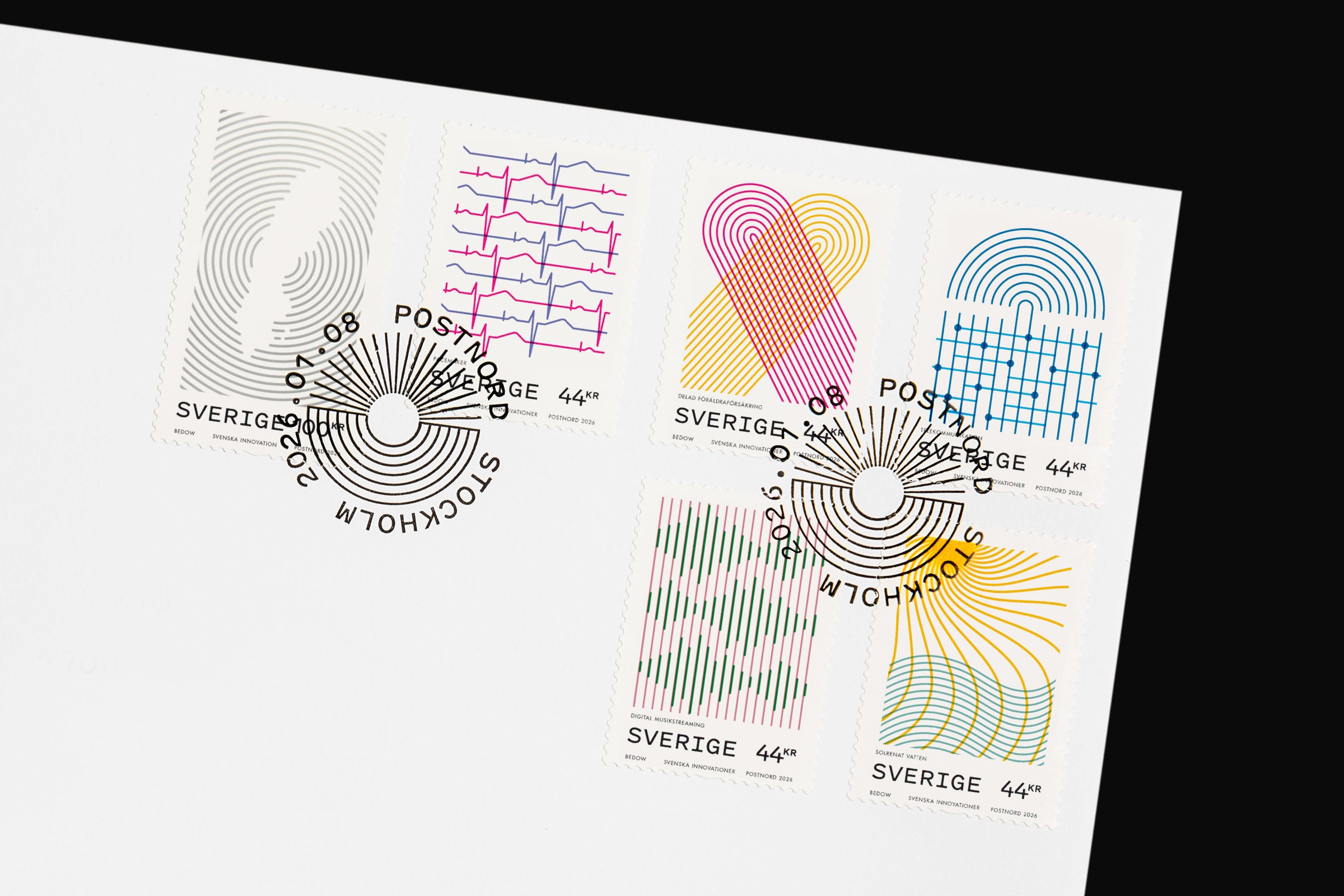 PostNord’s new stamp series showcases five Swedish innovations: the pacemaker, solar-purified water, telecommunications, digital music streaming, and shared parental leave. The stamps required a simple visual language that could represent a series of five very different motifs, while still being intricate enough for each stamp to function as a standalone piece on an envelope.