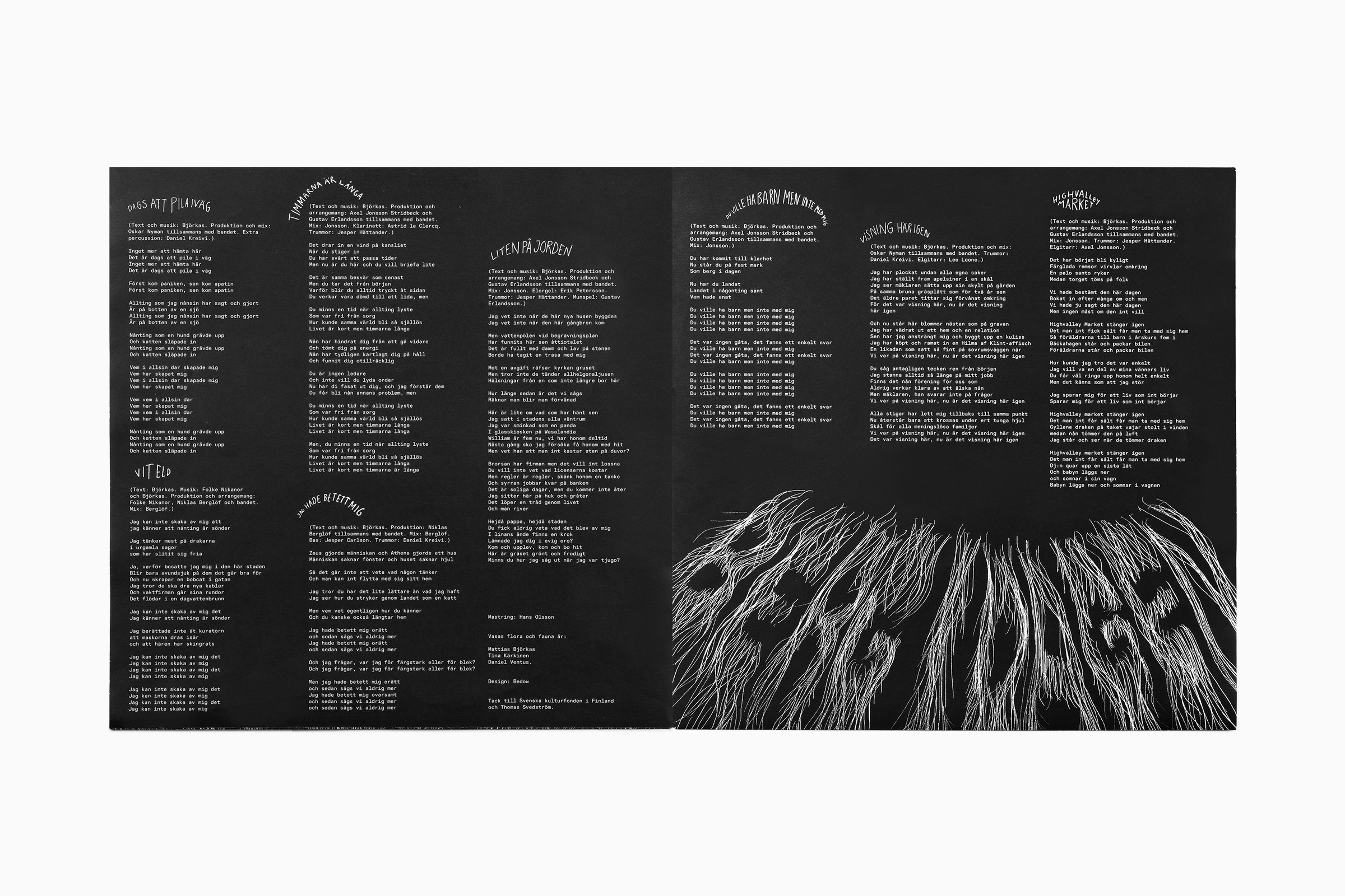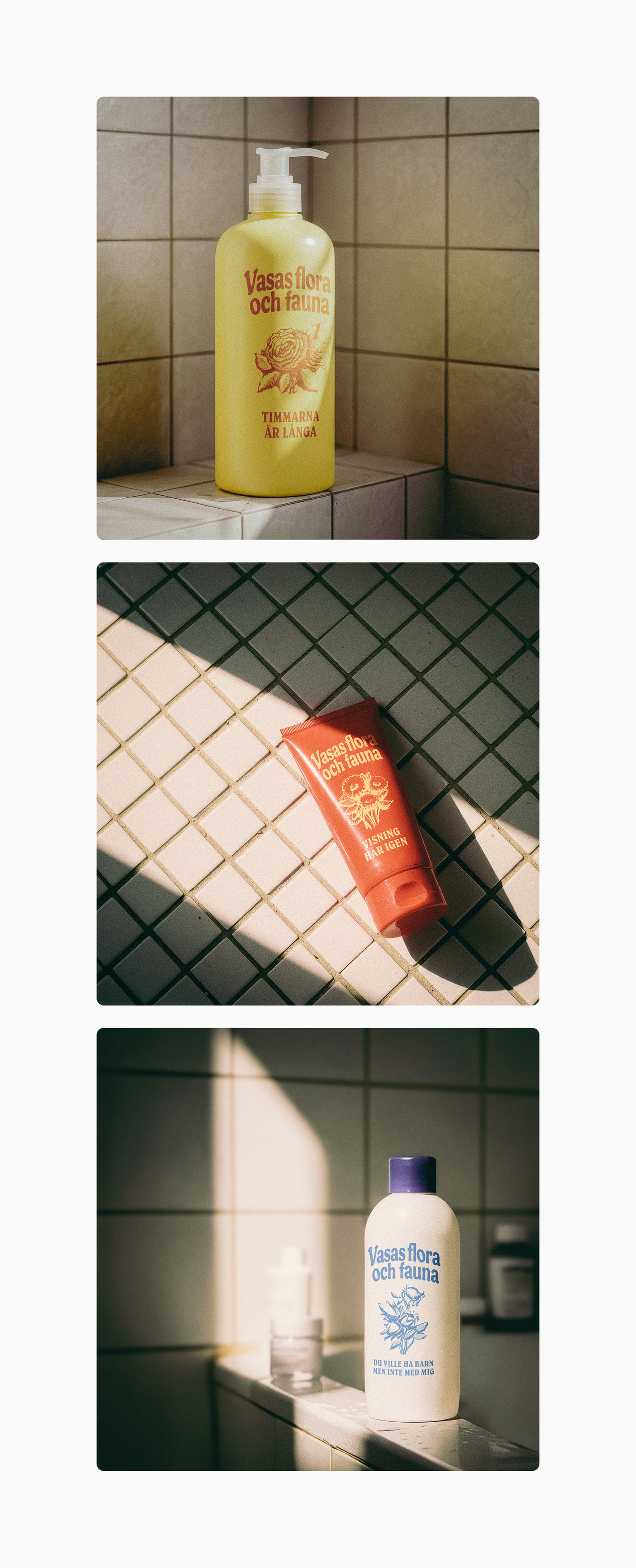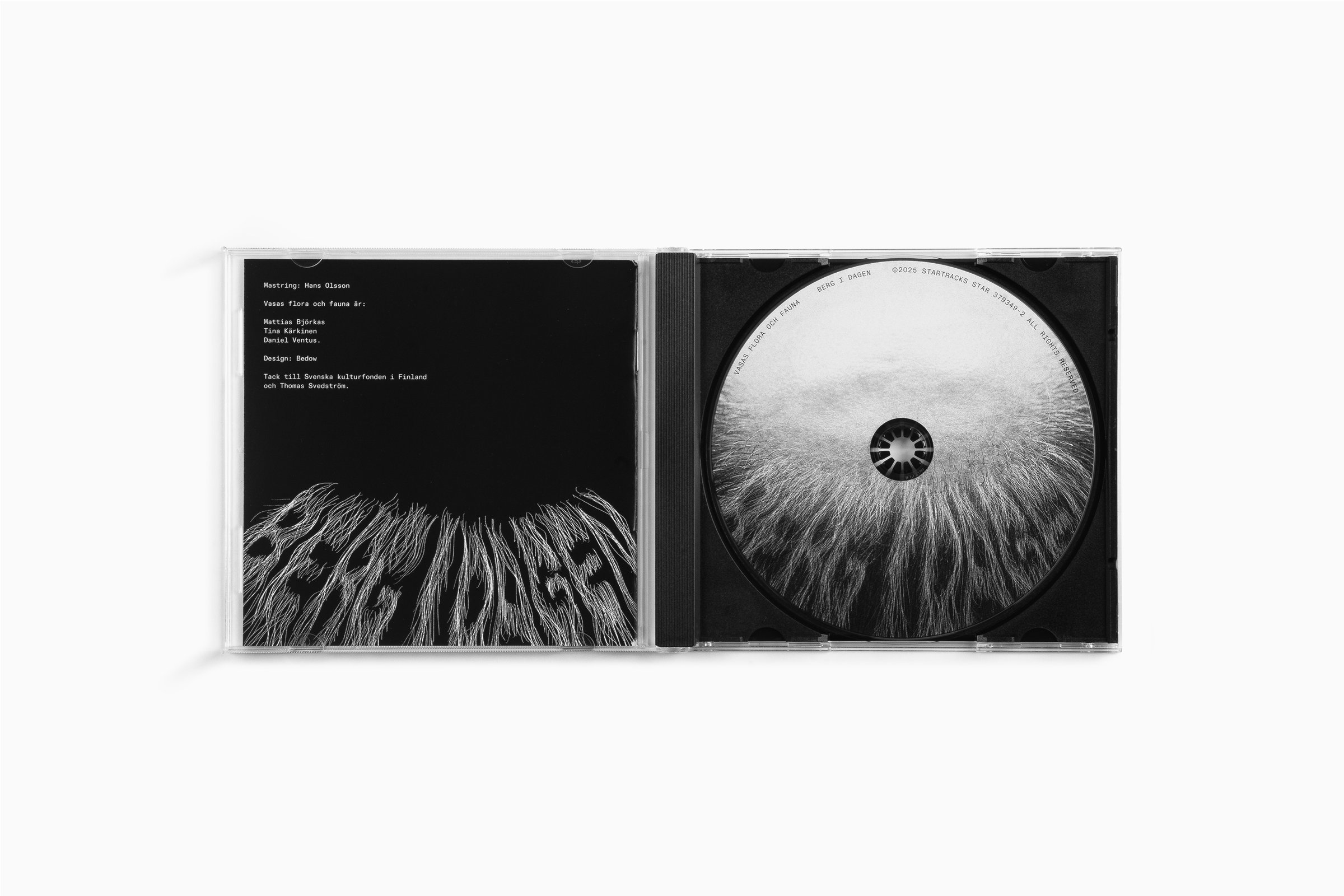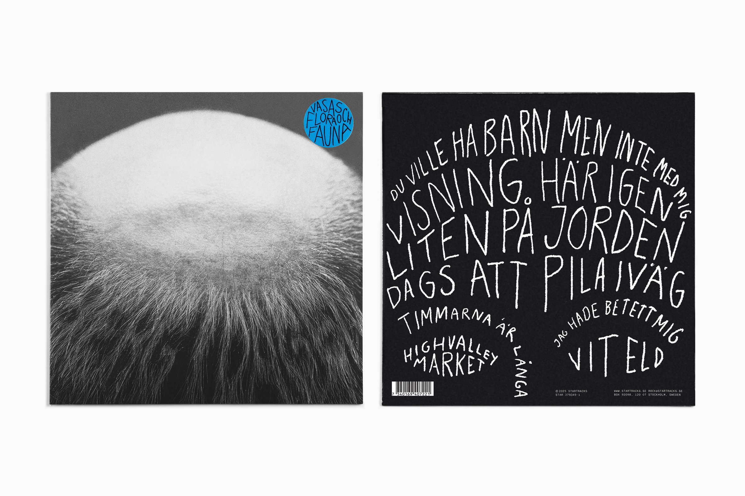 Berg i dagen is not only a beautiful expression for when a small hillock peeks out from the ground but also the title of Vasas Flora and Fauna’s new album. The expression is depicted on the album cover as a metaphor, with a bald head where grey hairs form the album title. The album cover design is complemented by three singles, where the band name and song titles are printed on hair care products.